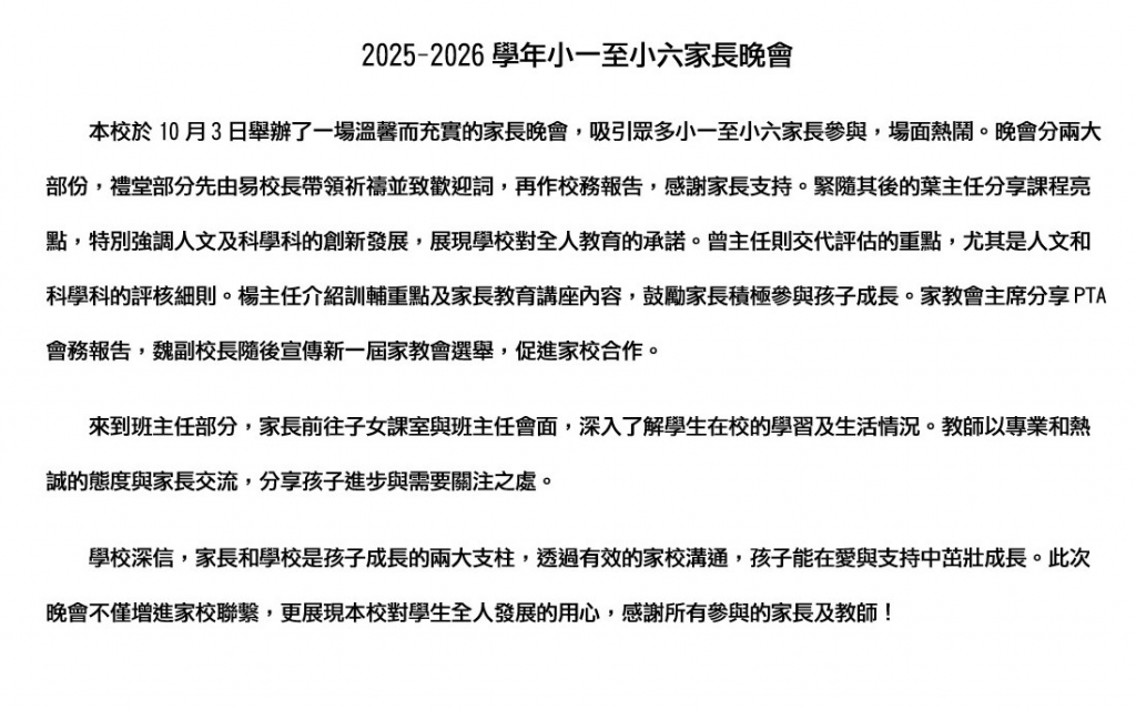 來一場溫馨而充實的家長晚會﹗ 本校於10月3日舉辦了一場溫馨而充實的家長晚會,吸引眾多小一至小六家長參與,場面熱鬧…