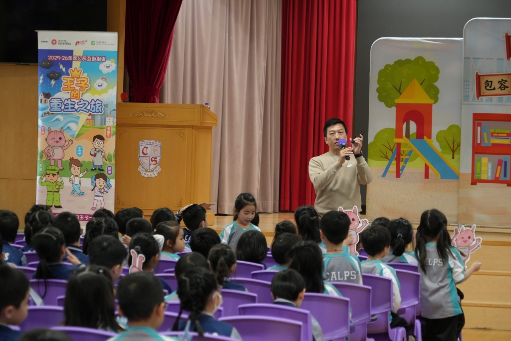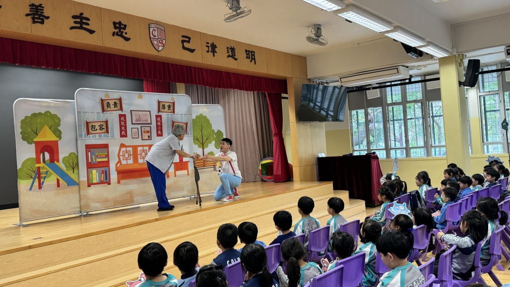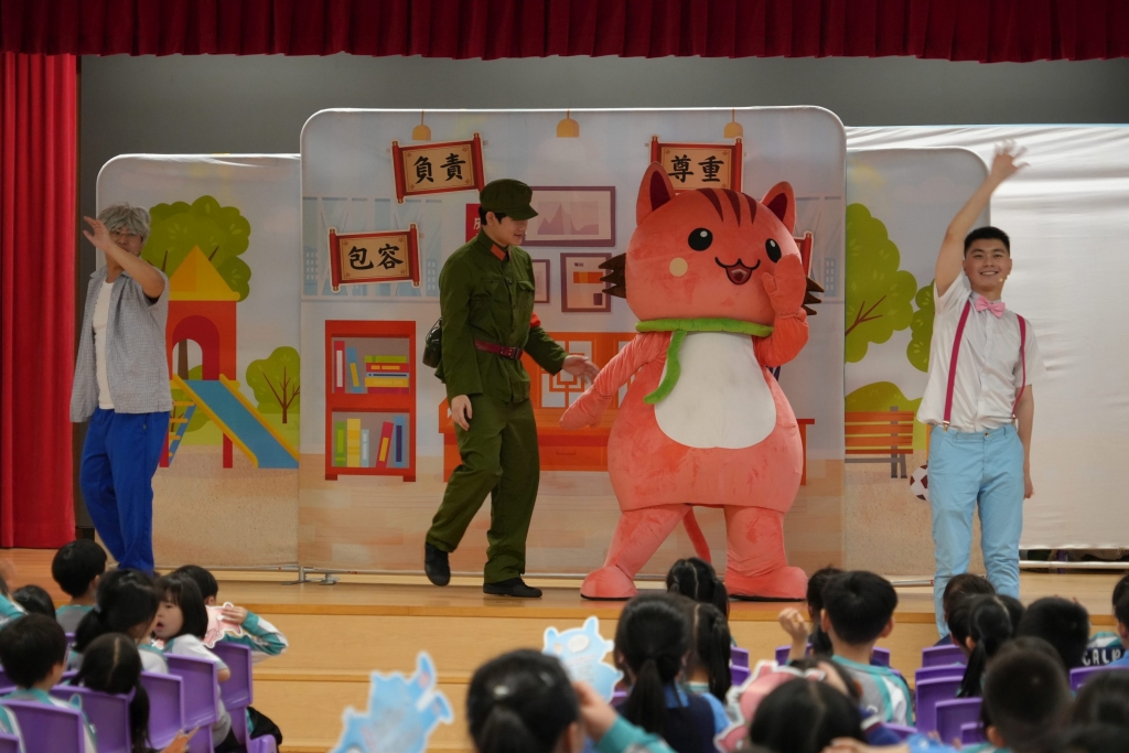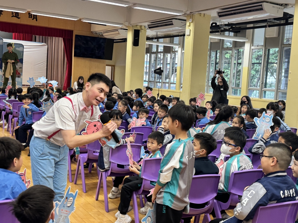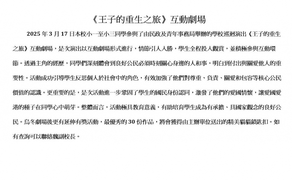 國安教育:《王子的重生之旅》互動劇場 本校小一至小三同學參與了由民政及青年事務局舉辦的學校巡迴演出《王子的重生之旅》互動劇場,是次演出以互動劇場形式進行,情節引人入勝,學生全程投入觀賞,並積極參與互動環節