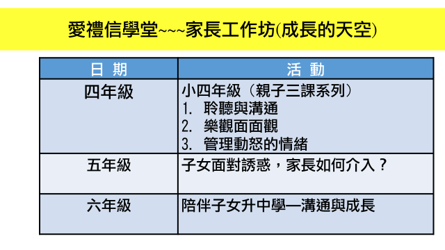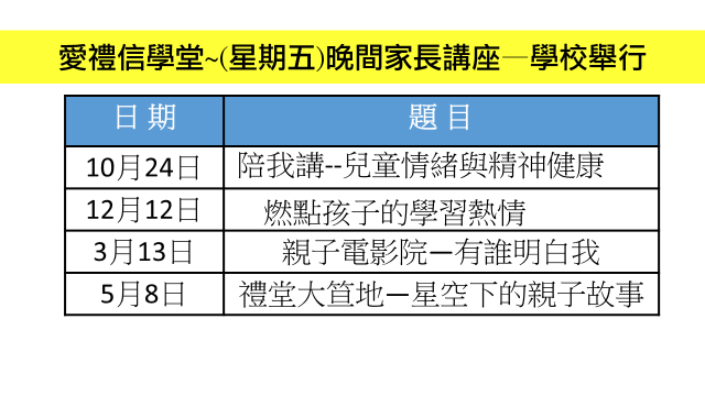 學校邀請不同富經驗的講者主持晚間家長講座,與家長分享與子女溝通的技巧,傳遞愛的語言。