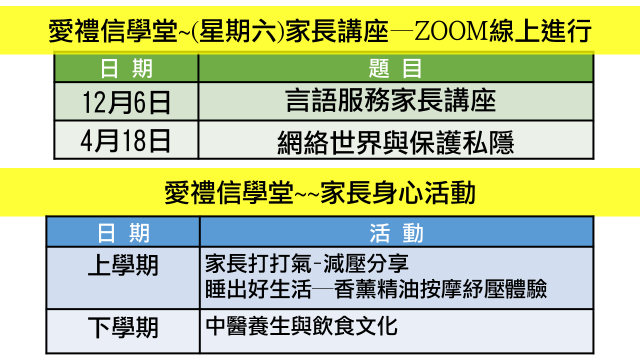 本學年成立愛禮信家長學堂,為鼓勵家長持續進修、增值自我及加強家校合作。本學年開辦「愛禮信家長學院」,每次家長參與由學校舉辦的家長活動(如:親子旅行、家長講座、家長工作坊、親子活動)或家教會舉辦的活動。