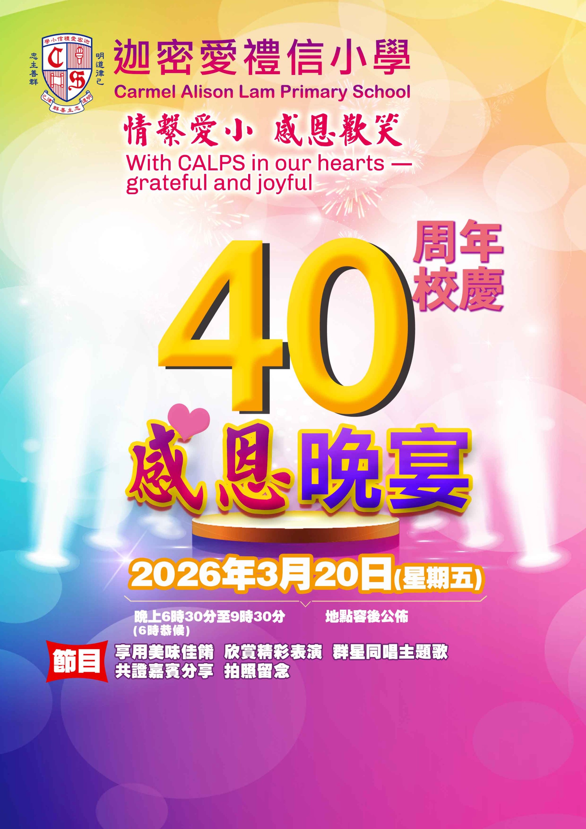 感謝神的帶領,本年度為迦密愛禮信小學40周年校慶。本校將於2026年3月20日(五)舉辦「校慶感恩晚宴」,藉此數算恩主多年的眷顧和恩典,並共同見證學校多年的努力發展及成果。期盼師生聚首一堂,一同分享喜悅,共證主恩!