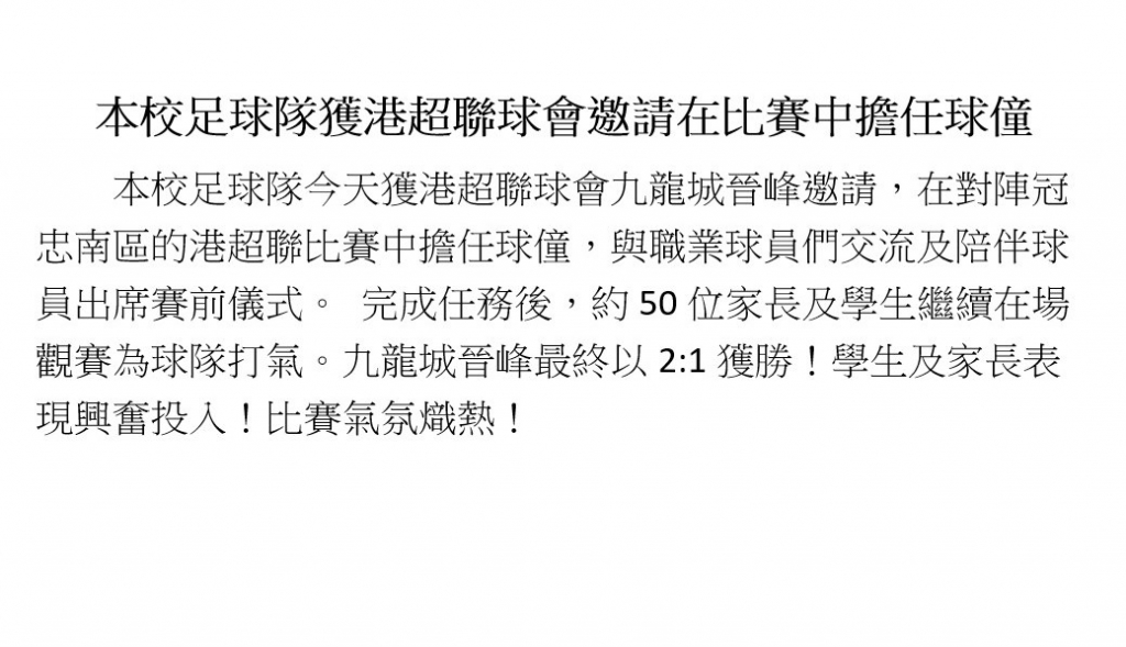 本校足球隊獲港超聯球會邀請在比賽中擔任球僮