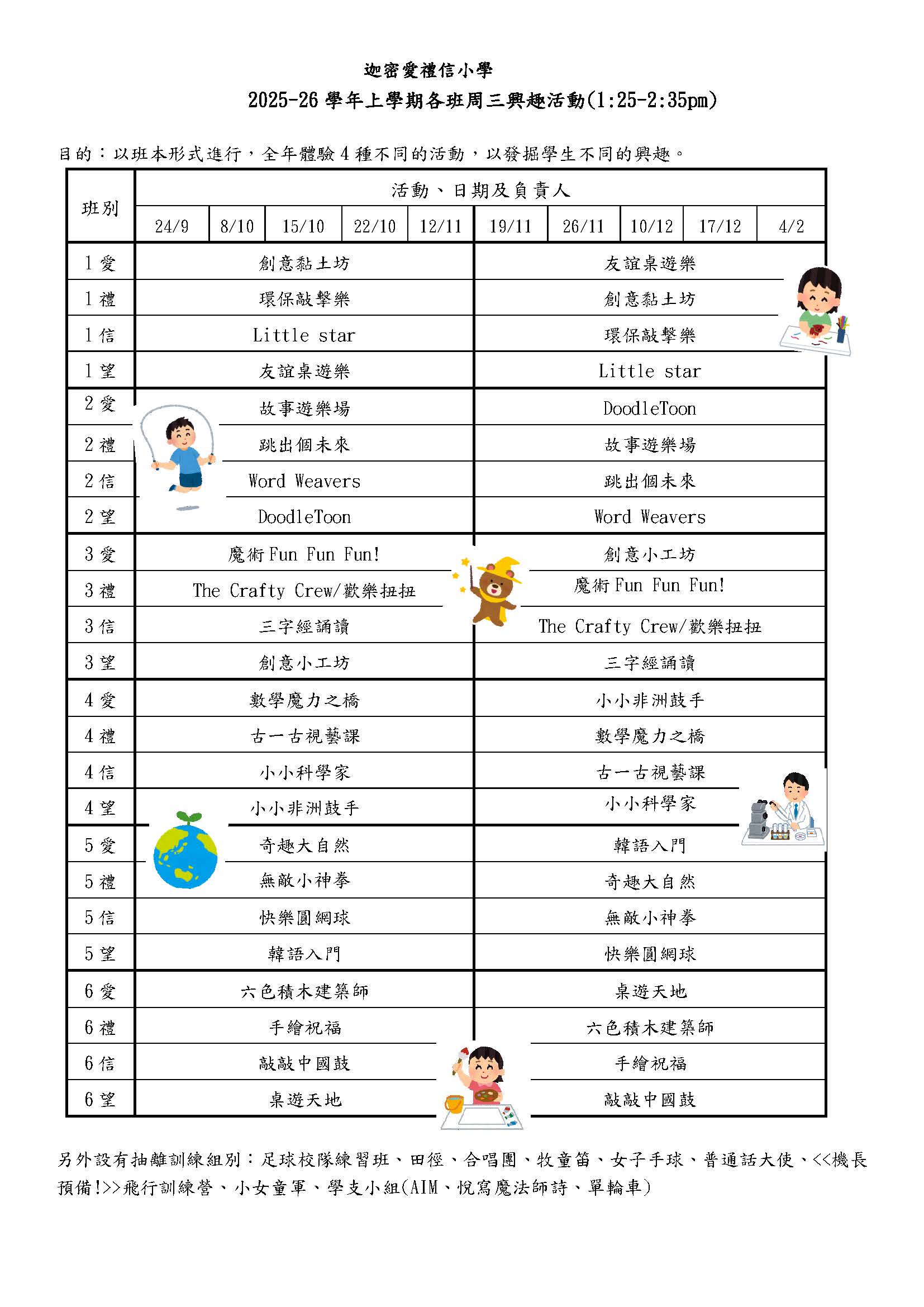 課外活動一覽表